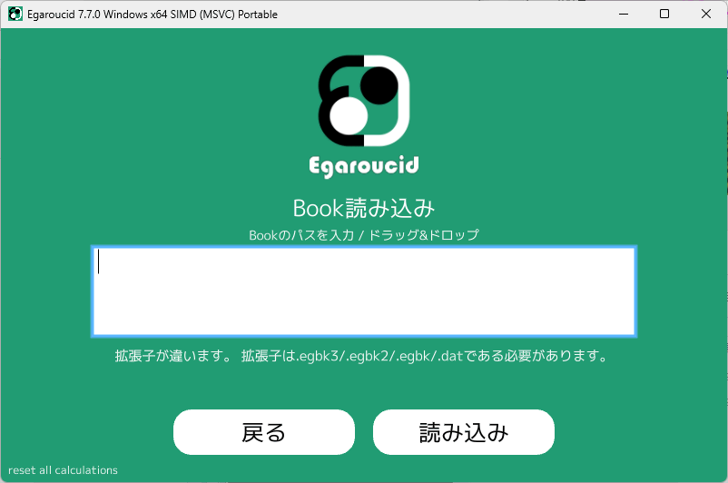 Egaroucidのbook(documentフォルダの中のbook.egbk3)を削除してから起動します(元のbookが必要ならどこかにセーブしておいて下さい)