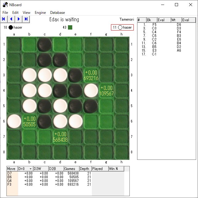 金魚定石の学習 2020.07.17 Edaxのbook、金魚定石・・・の何というのか、この局面の評価値がちゃんとするような学習をさせました。 実際学習させてみた人なら、ちょっと「あれ?」って思うかもしれません。 WZebraのbookが先行していて大体分かっていたので、それに従ってEdax側はもうちょっと先の局面を学習させると上記画像のようになりました。