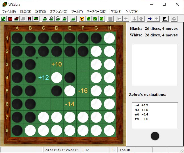 8×8のオセロのソフトに以下のように入力して解析するだけ。中央の6×6マスを使う。人間がどこに打ってもリアルタイムで解析可能。